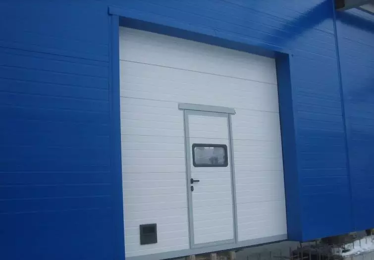 Белые секционные ворота с калиткой и окном ПВСК-10
